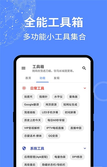 该app提供了与文字、图片、设备、清理、文件、计算、查询、相关的多种工具,基本满足您在日常使用手机时的所有工具需求。丰富的功能模块提高您的工作效率,并使您可以不用再经常寻找下载一些不怎么常用的工具app,让设备更加纯净。